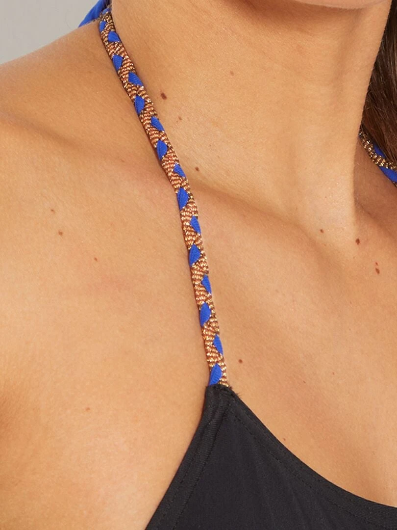 Un bañador estilo natación reinventado con detalles trenzados de color azul y dorado para darle un toque femenino.