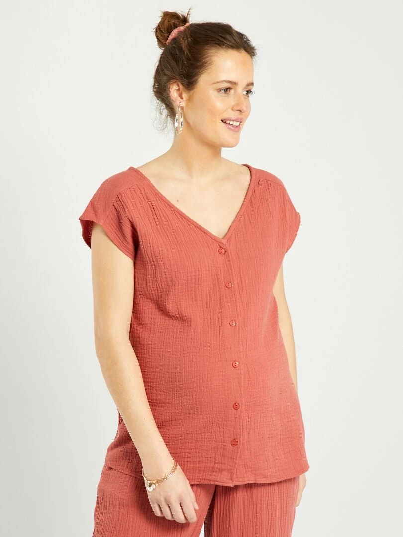 Si buscas una blusa elegante y cómoda para tu armario premamá, esta blusa de gasa de algodón es una opción excelente. Con su cierre de botones y sus mangas extracortas, es refinada y práctica para facilitar la lactancia.