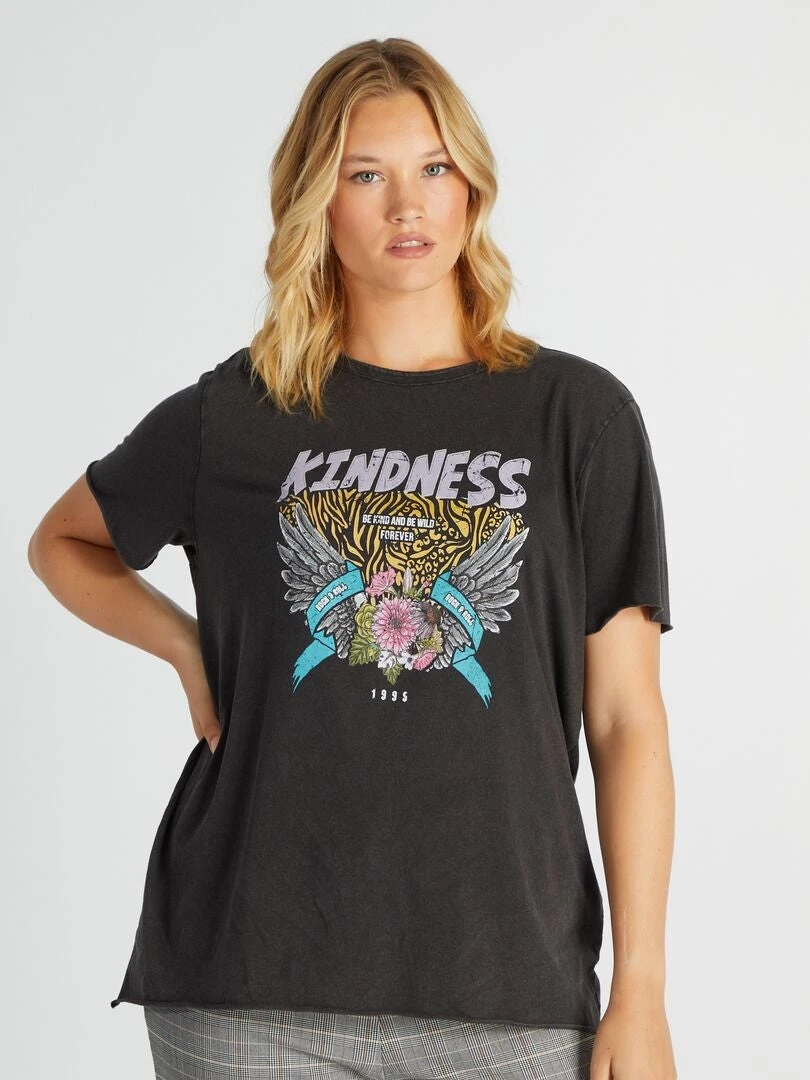 Una bonita camiseta de estilo rockero. Para un look completo, apuesta por una cazadora de material sintético y un vaquero negro. Si prefieres un look más minimalista, elige un pantalón ancho y unas zapatillas.
