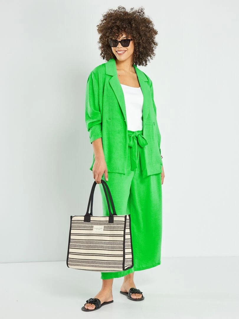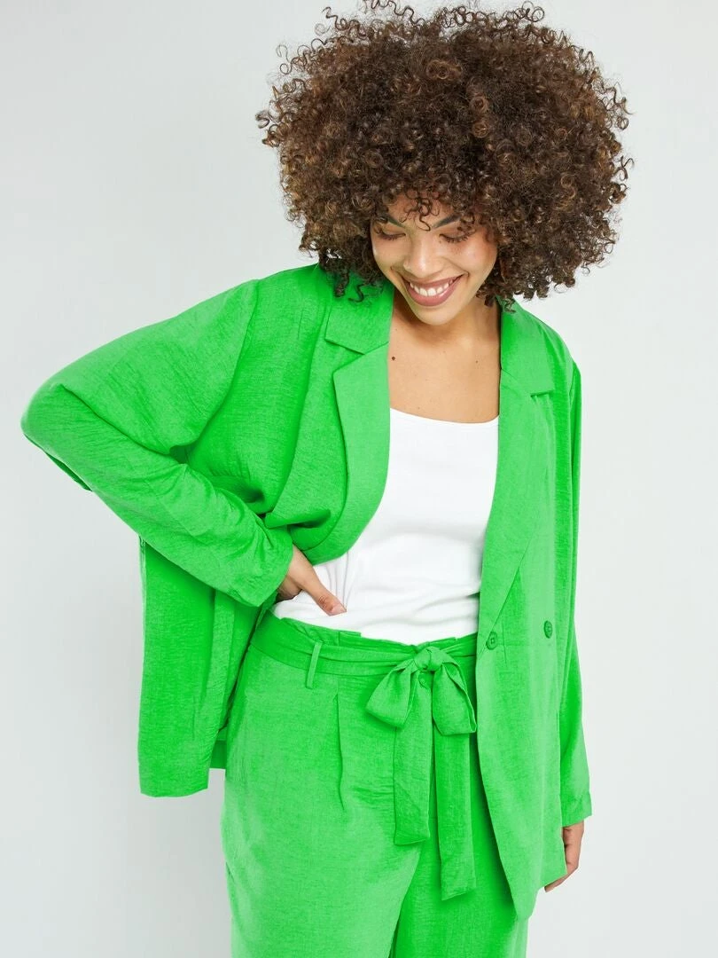 La chaqueta blazer no pasa de moda. Este color le da un toque alegre al look, te encantará.