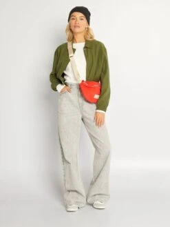 Una chaqueta ligera, caqui y cropped. Un acabado perfecto que aporta un buen toque de estilo.