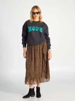 Esta falda midi y su corte evasé combinan con tus looks modernos.