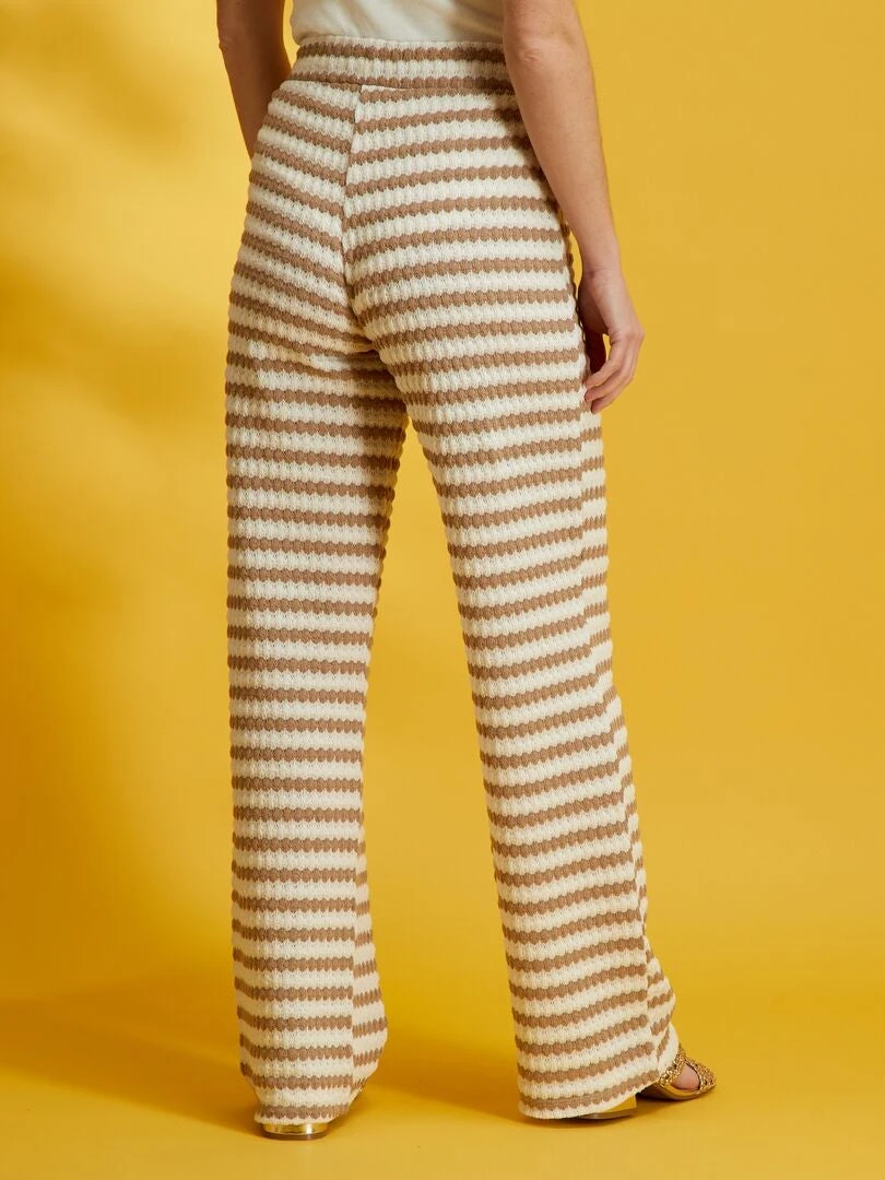 Un pantalón de punto croché con corte ancho y estampado de rayas. Pantalón flare