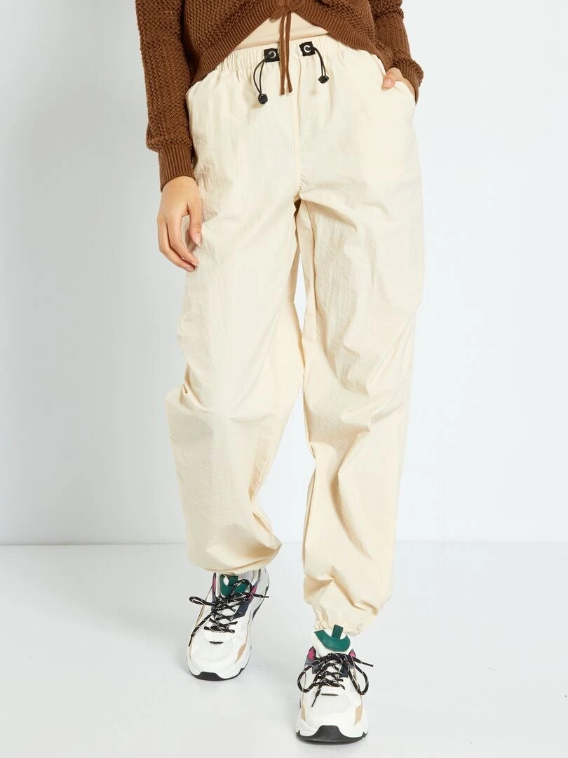 El pantalón parachute de los 90 vuelve a lo grande este año. Nos encanta con la cintura baja, un crop top y un bonito par de zapatillas.