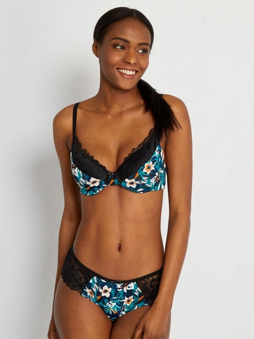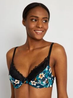– Apliques de encaje en los bordes de las copas y en el bajo