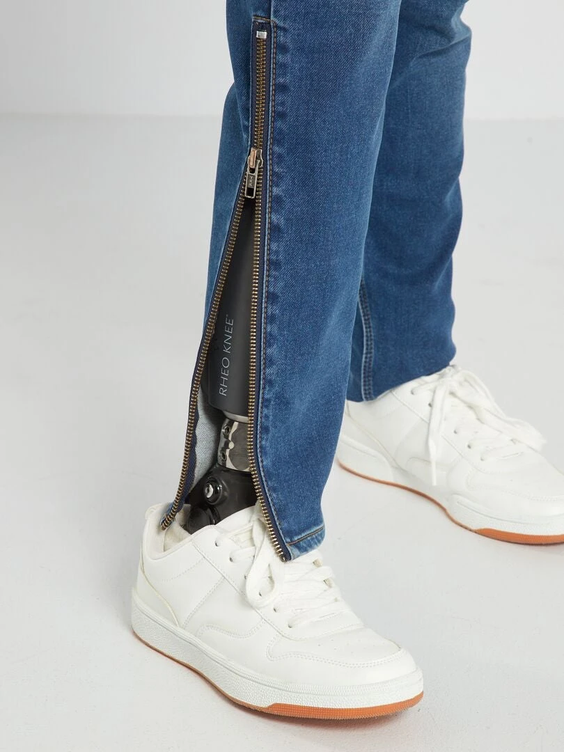 Un vaquero flexible con abertura de velcro en los laterales y tiras en el interior para facilitar su colocación. Sin bolsillos traseros para que resulte cómodo para las personas en silla de ruedas. Cintura regulable desde el interior. Parte trasera más alta para cubrir más.