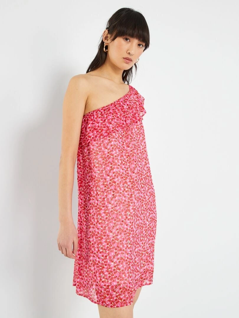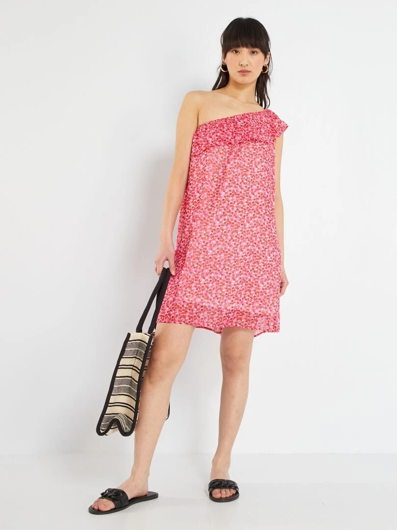 Un vestido femenino con hombros descubiertos y corte asimétrico.