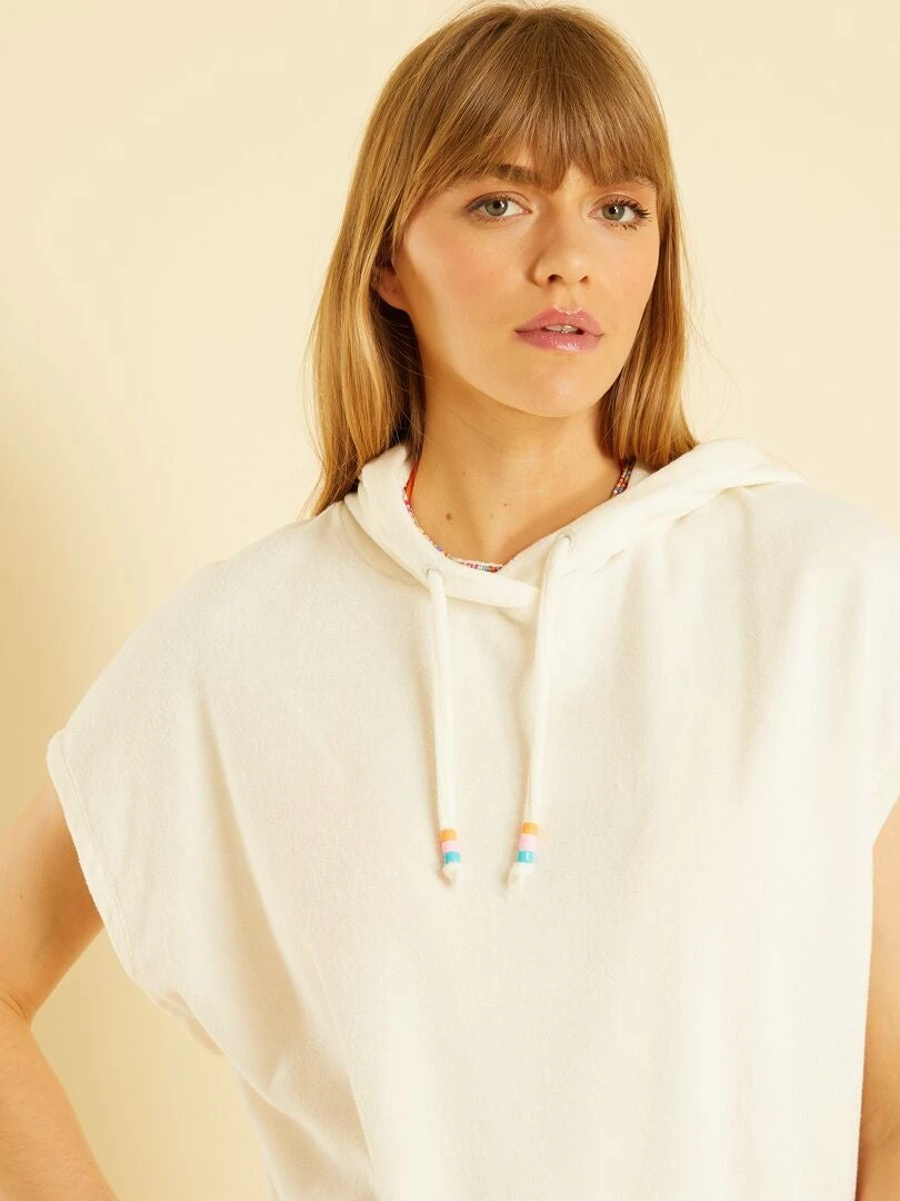 Este vestido de playa se reinventa con punto de rizo y detalles en perla. Ideal para abrigarse al salir del mar o la piscina.