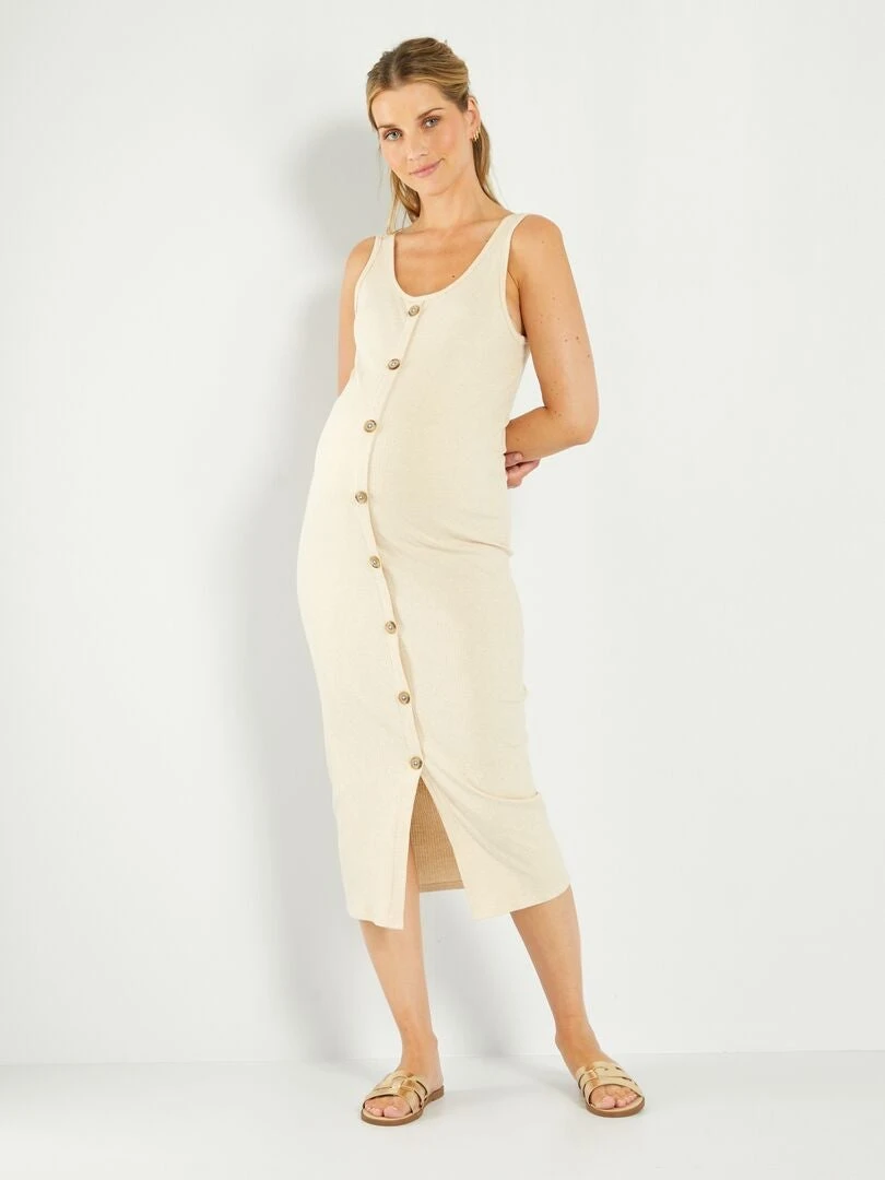 Este vestido largo de punto de canalé queda perfecto con una camisa abierta y sandalias.