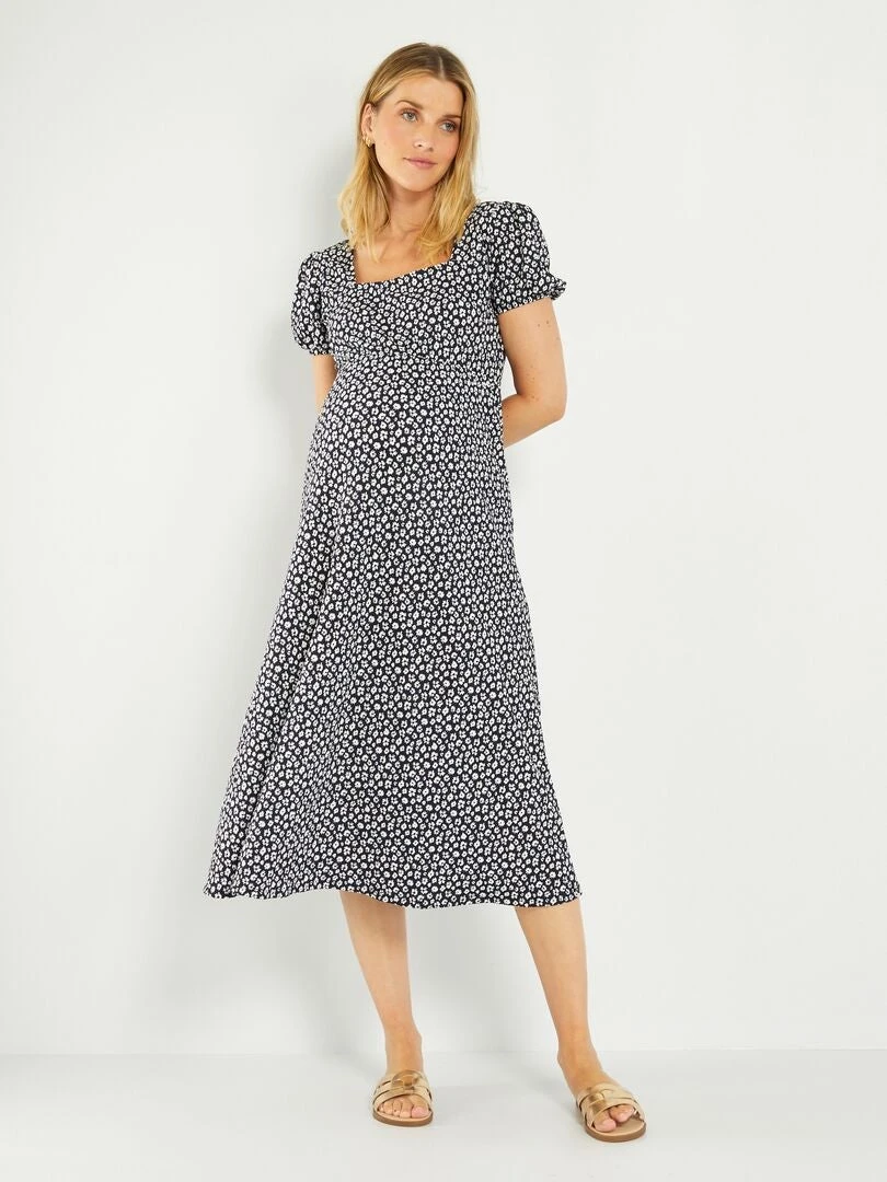 Este sencillo vestido de corte largo con un original cuello cuadrado es perfeto para un embarazo tranquilo en verano.