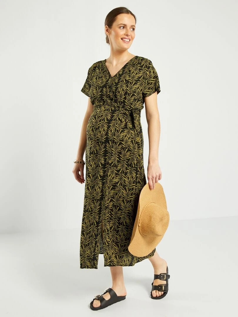 Este vestido premamá largo y estampado está diseñado para ofrecer comodidad y estilo a las futuras mamás. Ideal para ocasiones informales o días de sol, realza las formas del cuerpo sin apretar el vientre.